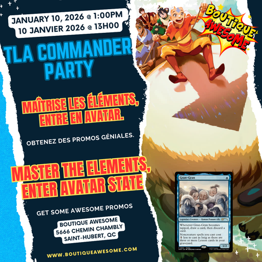 Wizards Of The CoastJoin us at Boutique Awesome for a Magic: The Gathering – Avatar: The Last Airbender Commander Party!Rejoignez-nous à Boutique Awesome pour une Comm...