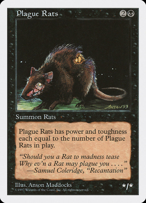Fifth EditionOut of stockPlague Rats's power and toughness are each equal to the number of creatures named Plague Rats on the battlefield.