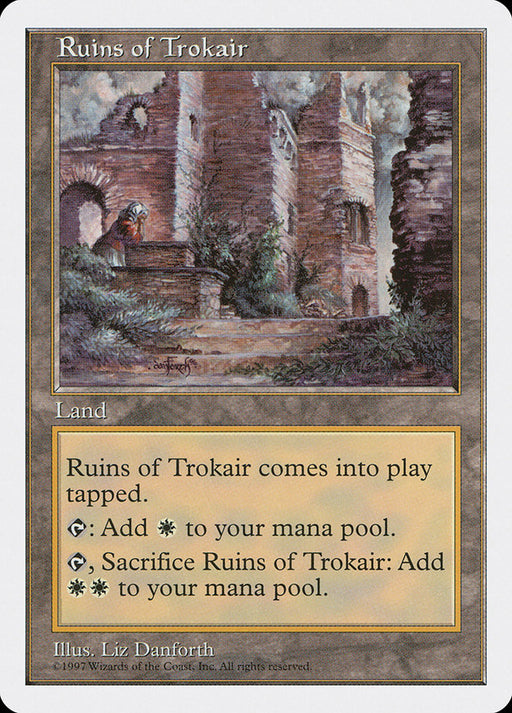 Fifth EditionOut of stockRuins of Trokair enters the battlefield tapped. {T}: Add {W}. {T}, Sacrifice Ruins of Trokair: Add {W}{W}.