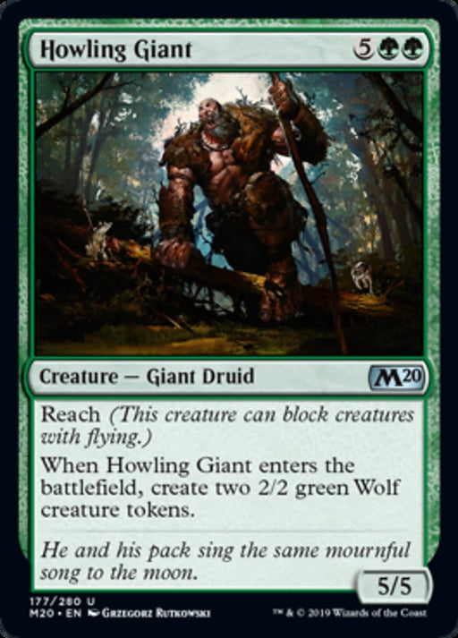 Core Set 2020Low stockReach (This creature can block creatures with flying.) When Howling Giant enters the battlefield, create two 2/2 green Wolf creature tokens.
