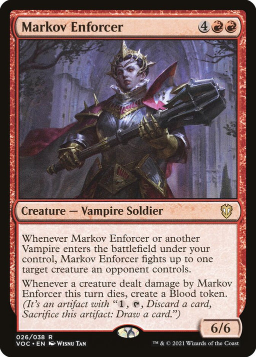 Crimson Vow CommanderOut of stockWhenever Markov Enforcer or another Vampire enters the battlefield under your control, Markov Enforcer fights up to one target creature an opponent...