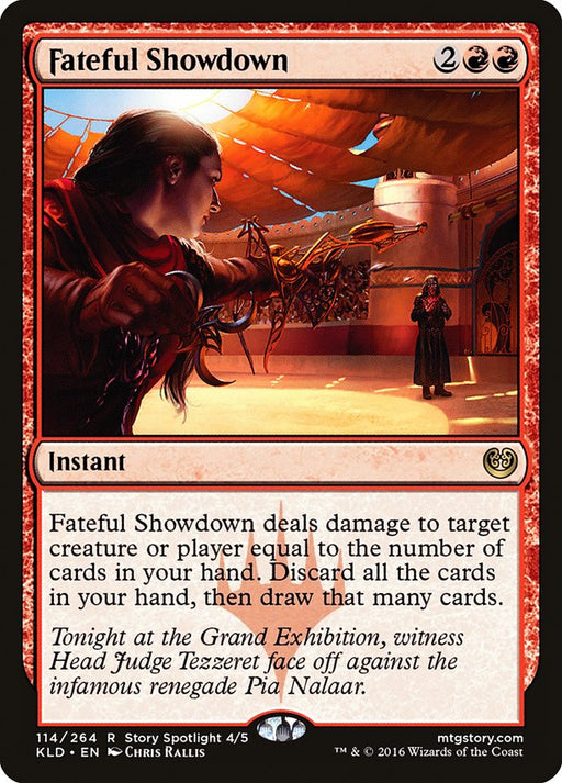 KaladeshOut of stockFateful Showdown deals damage to any target equal to the number of cards in your hand. Discard all the cards in your hand, then draw that many cards.