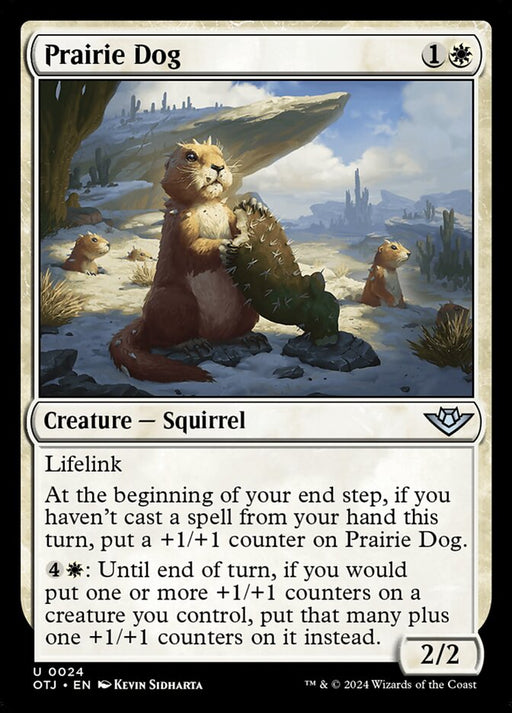 Outlaws of Thunder JunctionLow stockLifelink At the beginning of your end step, if you haven't cast a spell from your hand this turn, put a +1/+1 counter on Prairie Dog. {4}{W}: Until...