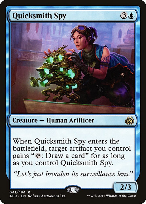 Aether RevoltIn stockWhen Quicksmith Spy enters the battlefield, target artifact you control gains "{T}: Draw a card" for as long as you control Quicksmith Spy.