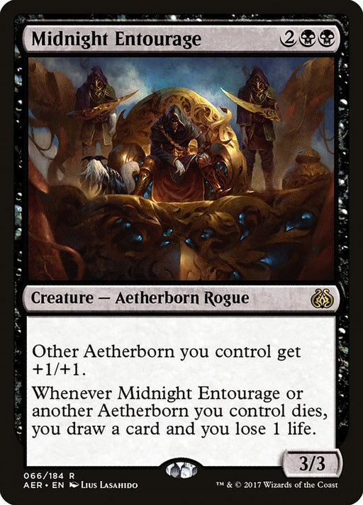 Aether RevoltIn stockOther Aetherborn you control get +1/+1. Whenever Midnight Entourage or another Aetherborn you control dies, you draw a card and you lose 1 life.