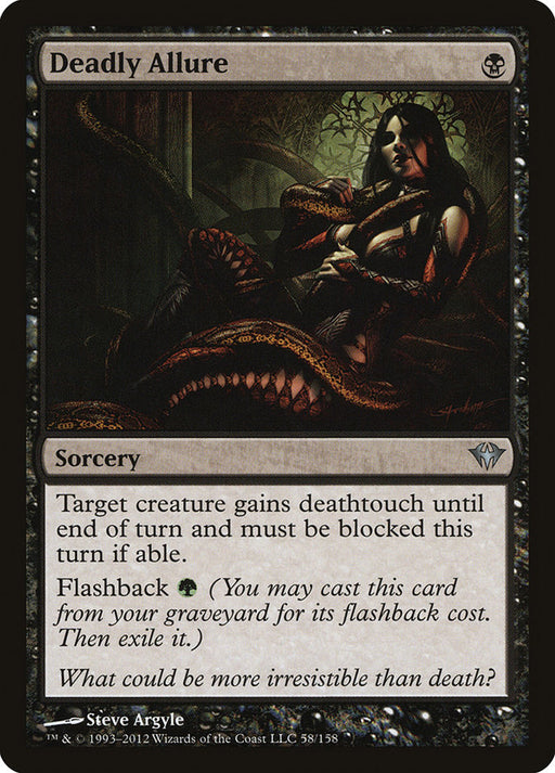 Dark AscensionIn stockTarget creature gains deathtouch until end of turn and must be blocked this turn if able. Flashback {G} (You may cast this card from your graveyard...