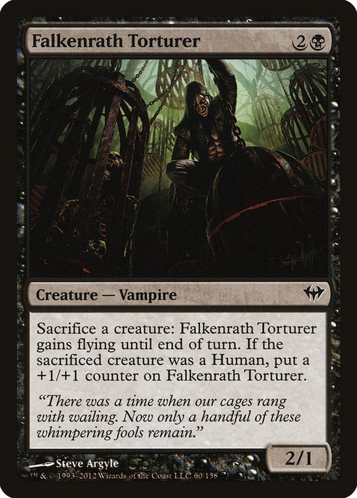 Dark AscensionIn stockSacrifice a creature: Falkenrath Torturer gains flying until end of turn. If the sacrificed creature was a Human, put a +1/+1 counter on Falkenrath...