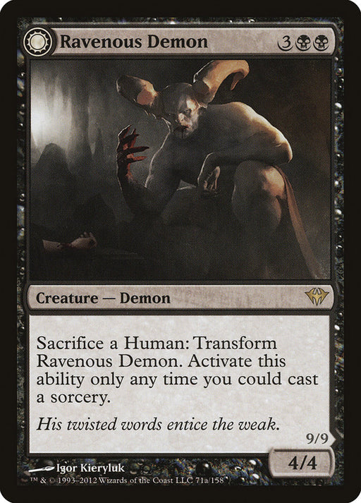 Dark AscensionLow stockSacrifice a Human: Transform Ravenous Demon. Activate this ability only any time you could cast a sorcery.