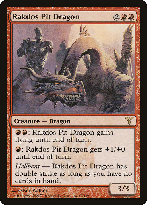 DissensionLow stock{R}{R}: Rakdos Pit Dragon gains flying until end of turn. {R}: Rakdos Pit Dragon gets +1/+0 until end of turn. Hellbent — Rakdos Pit Dragon has dou...