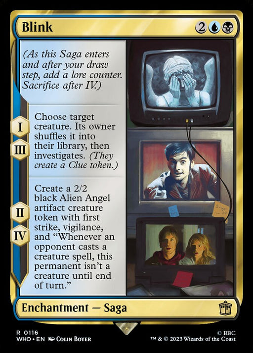 Doctor WhoLow stock(As this Saga enters and after your draw step, add a lore counter. Sacrifice after IV.) I, III — Choose target creature. Its owner shuffles it into...