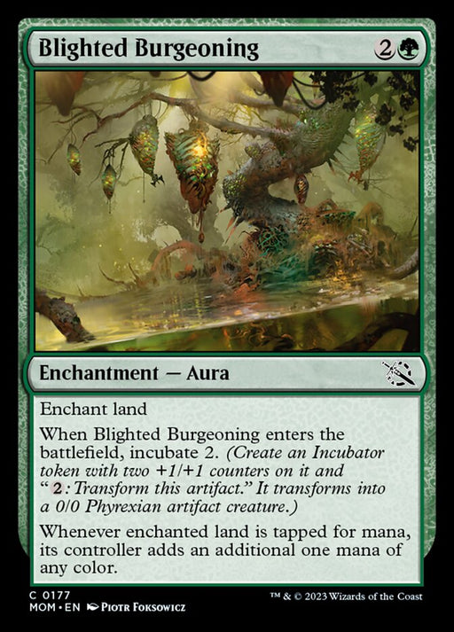 March of the MachineIn stockEnchant land When Blighted Burgeoning enters the battlefield, incubate 2. (Create an Incubator token with two +1/+1 counters on it and "{2}: Transf...