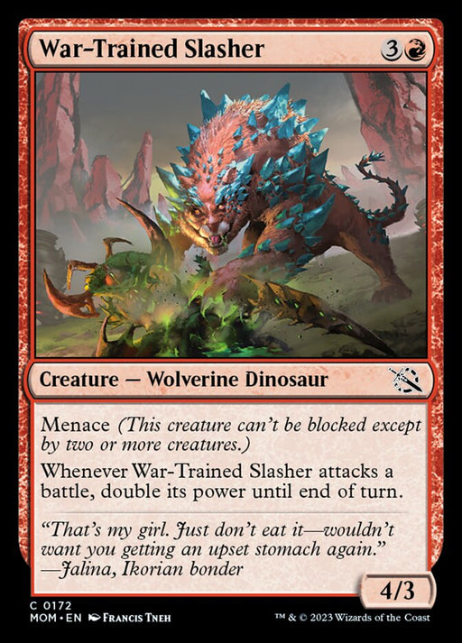March of the MachineIn stockMenace (This creature can't be blocked except by two or more creatures.) Whenever War-Trained Slasher attacks a battle, double its power until end ...