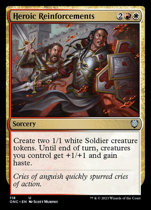 Phyrexia: All Will Be One CommanderLow stockCreate two 1/1 white Soldier creature tokens. Until end of turn, creatures you control get +1/+1 and gain haste. (They can attack and {T} this turn.)