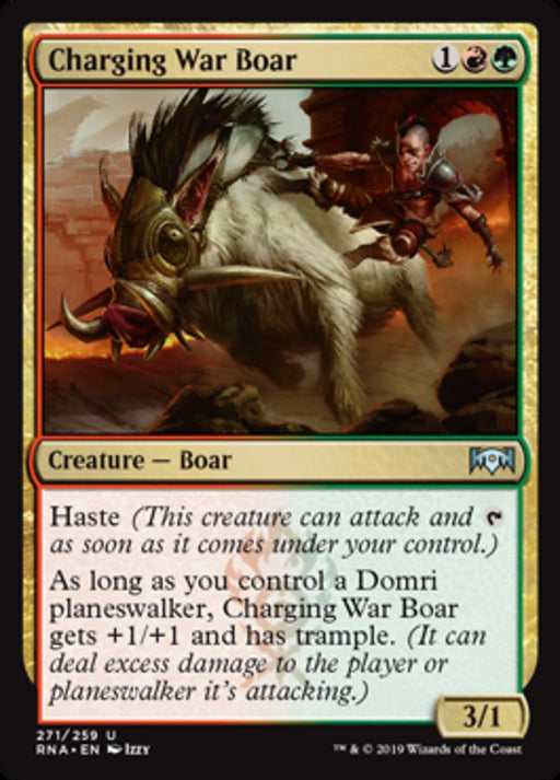 Ravnica AllegianceLow stockHaste (This creature can attack and {T} as soon as it comes under your control.) As long as you control a Domri planeswalker, Charging War Boar get...