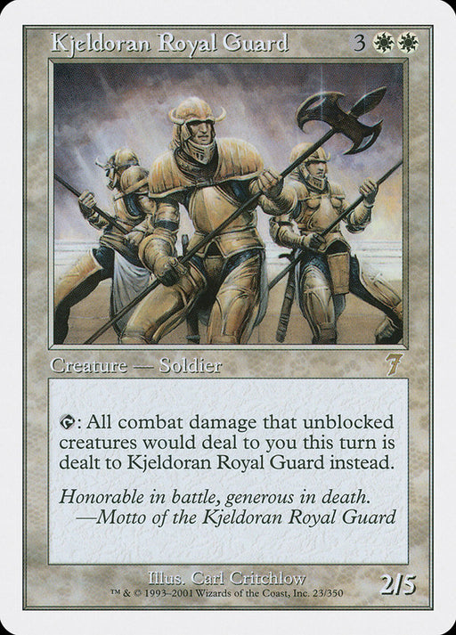 Seventh EditionLow stock{T}: All combat damage that would be dealt to you by unblocked creatures this turn is dealt to Kjeldoran Royal Guard instead.