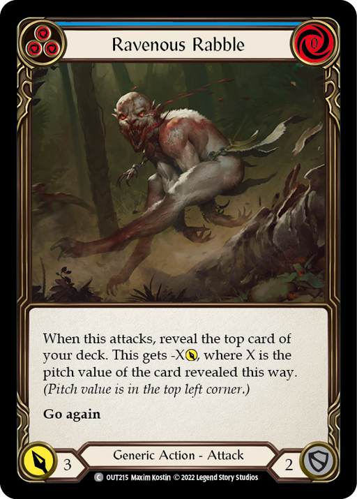 OutsidersIn stockReveal the top card of your deck. Ravenous Rabble gets [-X Attack], where X is the pitch value of the card revealed this way. **Go again**