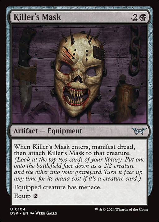 Duskmourn: House of HorrorLow stockWhen Killer's Mask enters, manifest dread, then attach Killer's Mask to that creature. (Look at the top two cards of your library. Put one onto the...