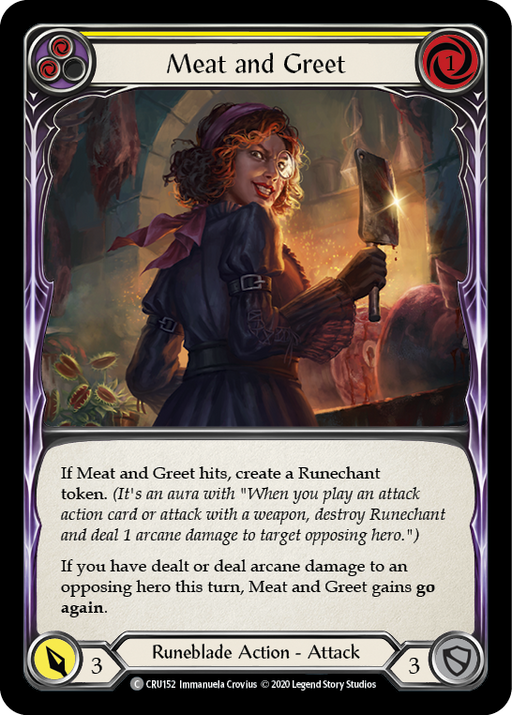 Crucible of WarLow stockIf Meat and Greet hits, create a Runechant Token. *(It's an aura with "When you play an attack action card or attack with a weapon, destroy Runecha...
