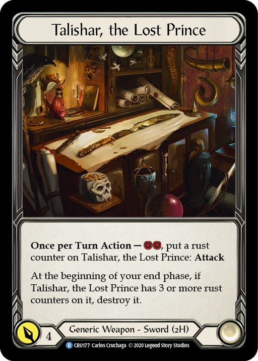 Crucible of WarLow stock**Once per Turn action** - [2 Resource], put a rust token on Talishar, the Lost Prince: **Attack** At the beginning of your end phase, if Talishar...