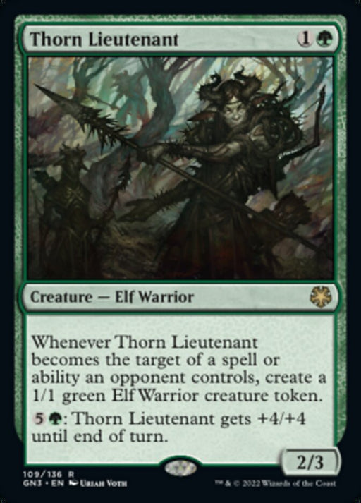 Game Night: Free-for-AllOut of stockWhenever Thorn Lieutenant becomes the target of a spell or ability an opponent controls, create a 1/1 green Elf Warrior creature token. {5}{G}: Tho...