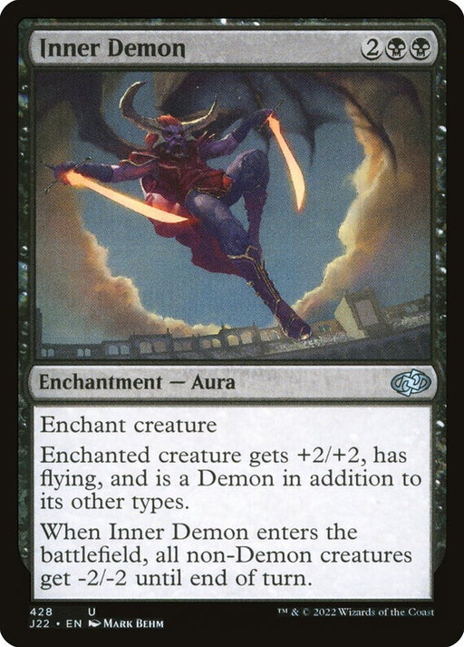 Jumpstart 2022Low stockEnchant creature Enchanted creature gets +2/+2, has flying, and is a Demon in addition to its other types. When Inner Demon enters the battlefield,...