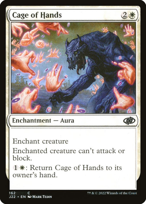 Jumpstart 2022Out of stockEnchant creature Enchanted creature can't attack or block. {1}{W}: Return Cage of Hands to its owner's hand.