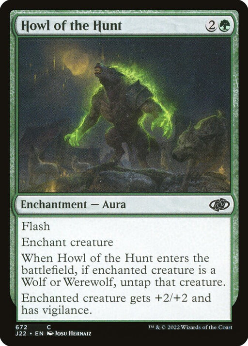 Jumpstart 2022Low stockFlash Enchant creature When Howl of the Hunt enters the battlefield, if enchanted creature is a Wolf or Werewolf, untap that creature. Enchanted cr...