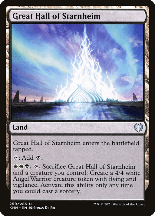 KaldheimLow stockGreat Hall of Starnheim enters the battlefield tapped. {T}: Add {B}. {W}{W}{B}, {T}, Sacrifice Great Hall of Starnheim and a creature you control: ...