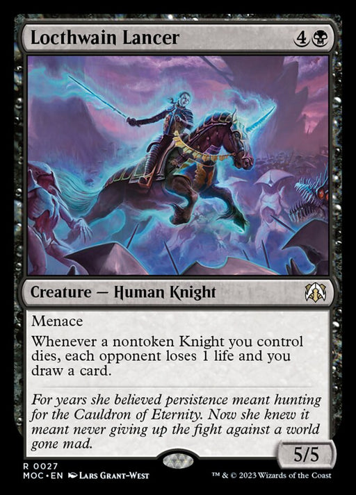 March of the Machine CommanderOut of stockMenace Whenever a nontoken Knight you control dies, each opponent loses 1 life and you draw a card.