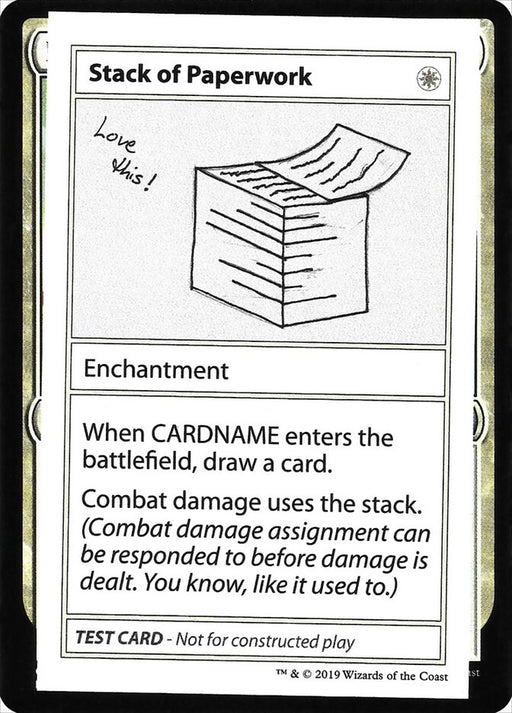 Mystery Booster Playtest Cards 2021Out of stockWhen Stack of Paperwork enters the battlefield, draw a card. Combat damage uses the stack. (Combat damage assignment can be responded to before dam...