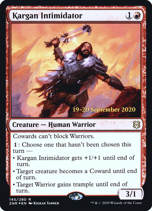 Zendikar Rising PromosOut of stockCowards can't block Warriors. {1}: Choose one that hasn't been chosen this turn — • Kargan Intimidator gets +1/+1 until end of turn. • Target creat...