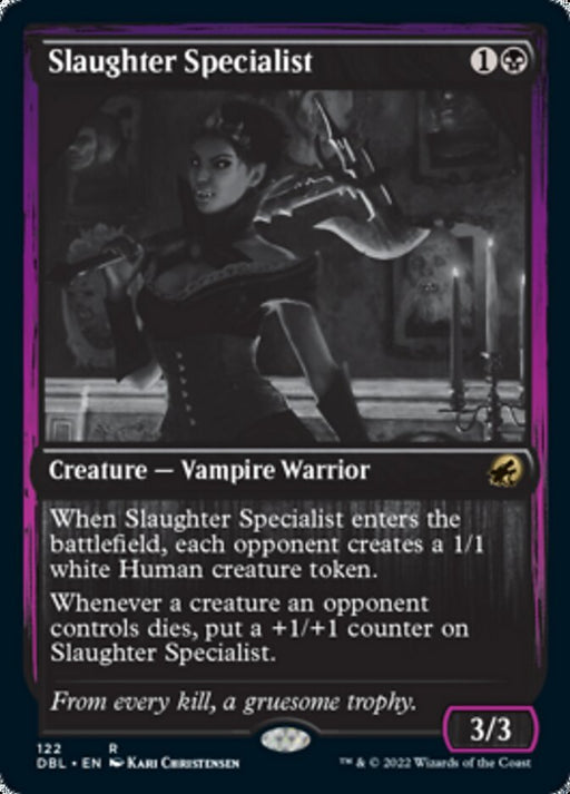 Innistrad: Double FeatureOut of stockWhen Slaughter Specialist enters the battlefield, each opponent creates a 1/1 white Human creature token. Whenever a creature an opponent controls ...