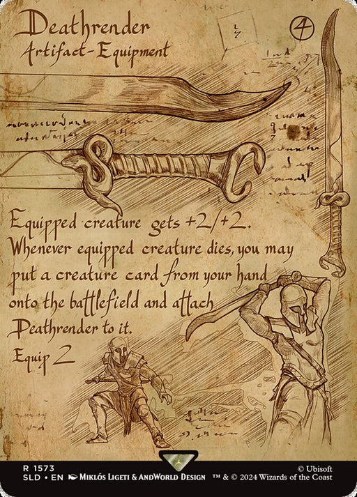 Secret Lair DropOut of stockEquipped creature gets +2/+2. Whenever equipped creature dies, you may put a creature card from your hand onto the battlefield and attach Deathrend...