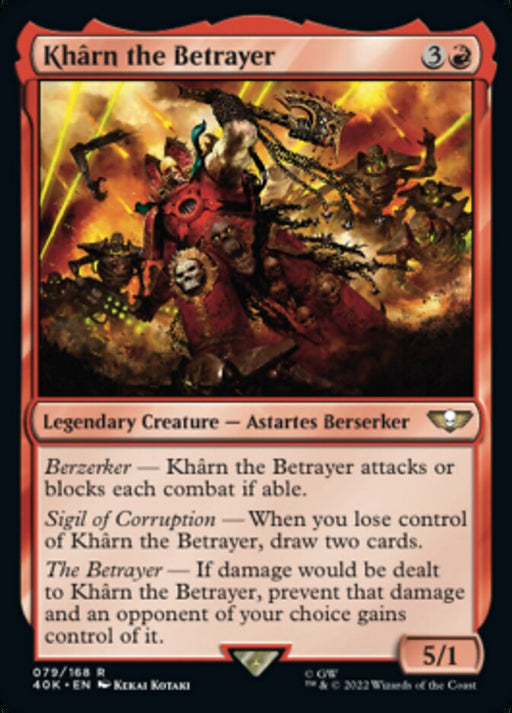Warhammer 40000 CommanderOut of stockBerzerker — Khârn the Betrayer attacks or blocks each combat if able. Sigil of Corruption — When you lose control of Khârn the Betrayer, draw two c...