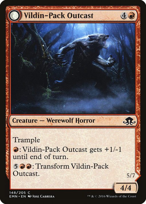 Eldritch MoonIn stockTrample {R}: Vildin-Pack Outcast gets +1/-1 until end of turn. {5}{R}{R}: Transform Vildin-Pack Outcast.