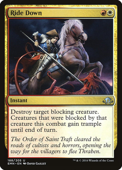 Eldritch MoonIn stockDestroy target blocking creature. Creatures that were blocked by that creature this combat gain trample until end of turn.