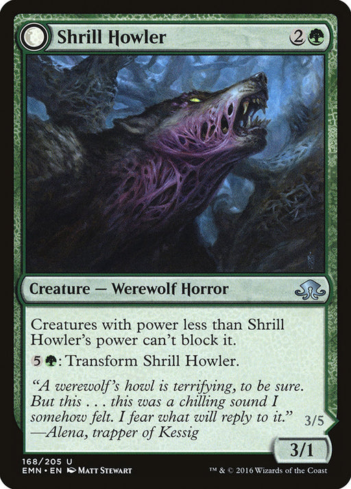 Eldritch MoonIn stockCreatures with power less than Shrill Howler's power can't block it. {5}{G}: Transform Shrill Howler.