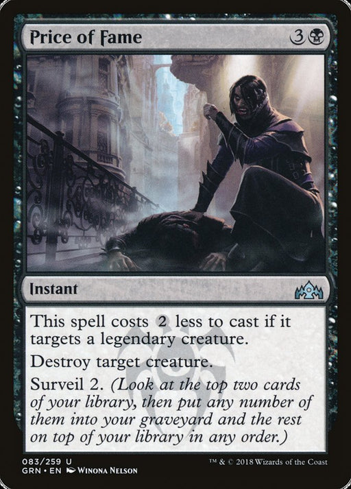 Guilds of RavnicaIn stockThis spell costs {2} less to cast if it targets a legendary creature. Destroy target creature. Surveil 2. (Look at the top two cards of your librar...