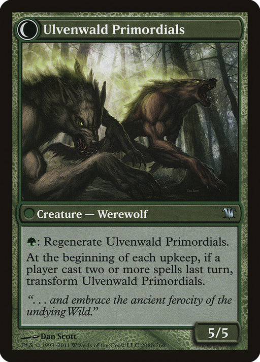 InnistradIn stock{G}: Regenerate Ulvenwald Primordials. At the beginning of each upkeep, if a player cast two or more spells last turn, transform Ulvenwald Primordi...