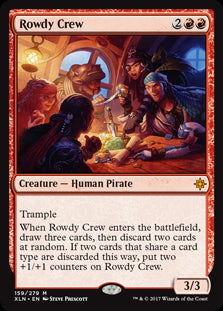IxalanIn stockTrample When Rowdy Crew enters the battlefield, draw three cards, then discard two cards at random. If two cards that share a card type are discard...