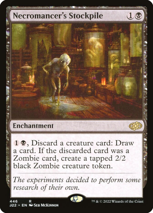 Jumpstart 2022Low stock{1}{B}, Discard a creature card: Draw a card. If the discarded card was a Zombie card, create a tapped 2/2 black Zombie creature token.