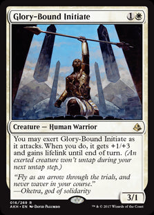 AmonkhetIn stockYou may exert Glory-Bound Initiate as it attacks. When you do, it gets +1/+3 and gains lifelink until end of turn. (An exerted creature won't untap...