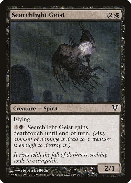 Avacyn RestoredIn stockFlying {3}{B}: Searchlight Geist gains deathtouch until end of turn. (Any amount of damage it deals to a creature is enough to destroy it.)
