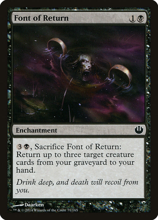 Journey into NyxIn stock{3}{B}, Sacrifice Font of Return: Return up to three target creature cards from your graveyard to your hand.
