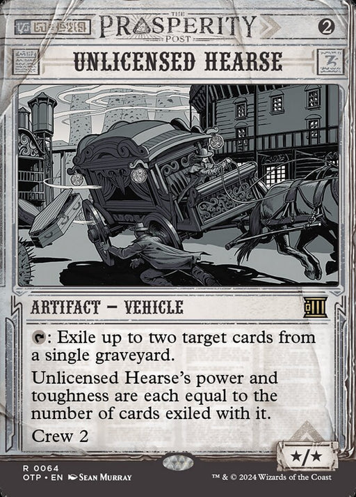 Breaking NewsOut of stock{T}: Exile up to two target cards from a single graveyard. Unlicensed Hearse's power and toughness are each equal to the number of cards exiled wit...
