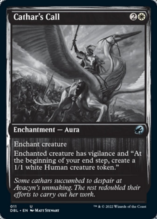 Innistrad: Double FeatureOut of stockEnchant creature Enchanted creature has vigilance and "At the beginning of your end step, create a 1/1 white Human creature token."