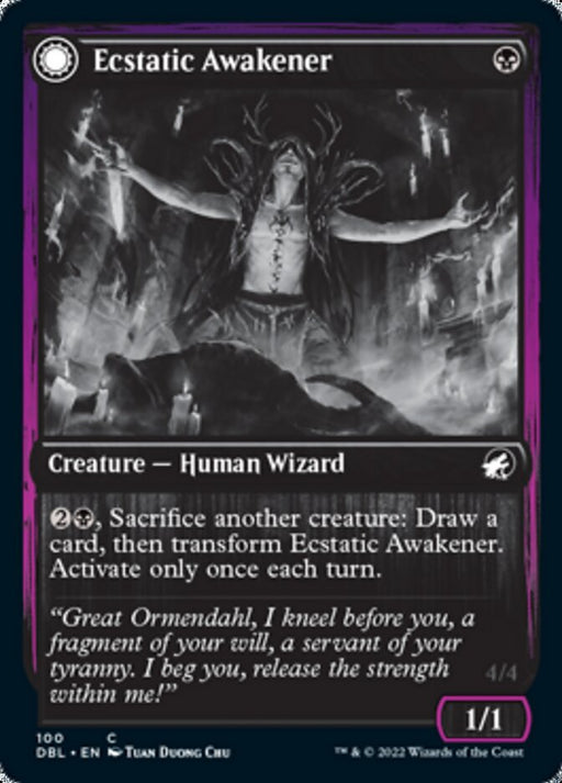 Innistrad: Double FeatureOut of stock{2}{B}, Sacrifice another creature: Draw a card, then transform Ecstatic Awakener. Activate only once each turn.
