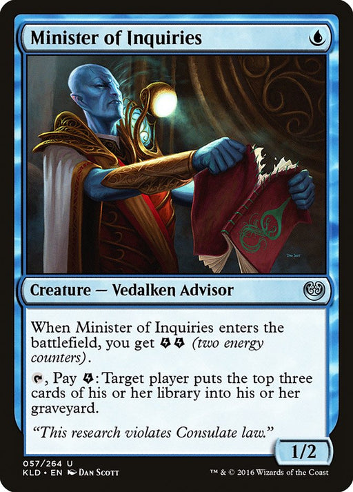 KaladeshIn stockWhen Minister of Inquiries enters the battlefield, you get {E}{E} (two energy counters). {T}, Pay {E}: Target player puts the top three cards of th...