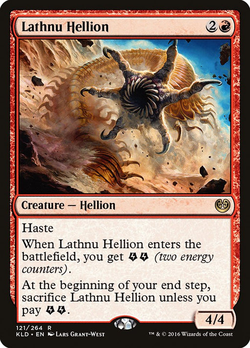 KaladeshIn stockHaste When Lathnu Hellion enters the battlefield, you get {E}{E} (two energy counters). At the beginning of your end step, sacrifice Lathnu Hellion...