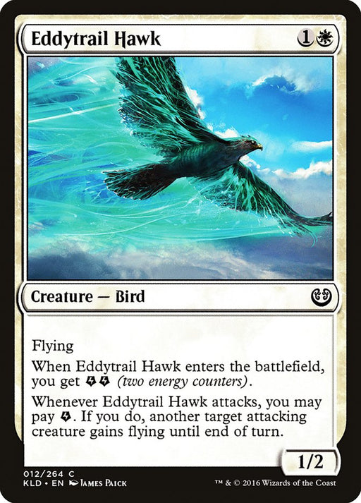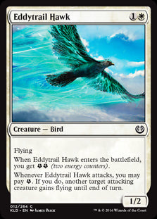 KaladeshIn stockFlying When Eddytrail Hawk enters the battlefield, you get {E}{E} (two energy counters). Whenever Eddytrail Hawk attacks, you may pay {E}. If you d...